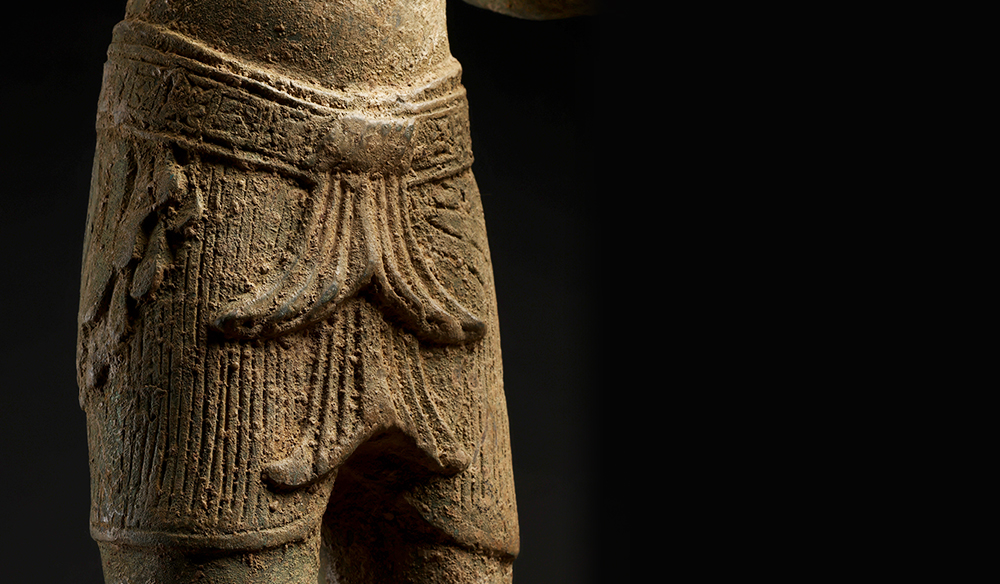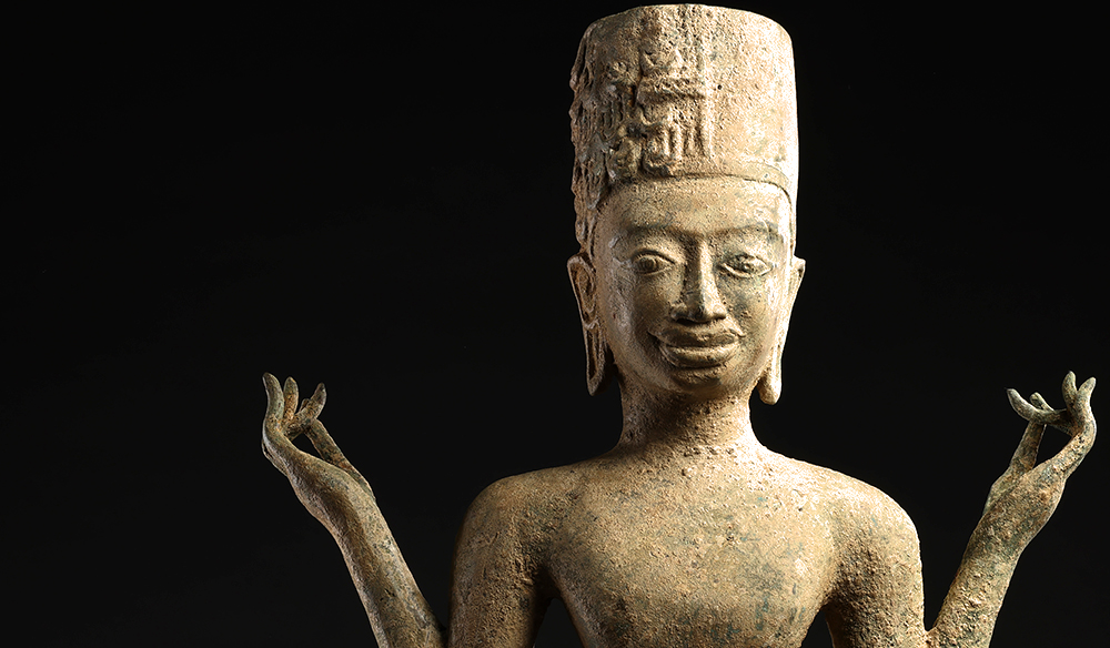 此造像為高棉吳哥窟風格的毗濕奴青銅立像,毗濕奴頭戴寶冠,身著中南半島特色的桑帕(Sampot)短褲,腰間繫著吳哥王公貴族風格的腰帶,但手上原本持有的法器已經不見。
